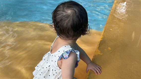 夫・長女チーム、私・次女チームに分かれて着替え、8階のプールに集合!