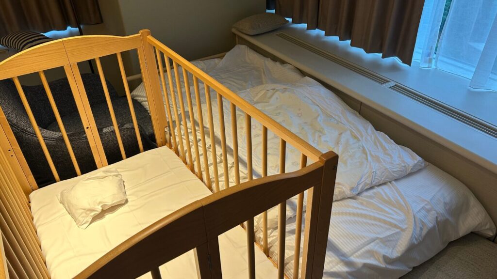 ハイタイプのベビーベッド、ベッド柵、オムツゴミ箱を用意していただきました。