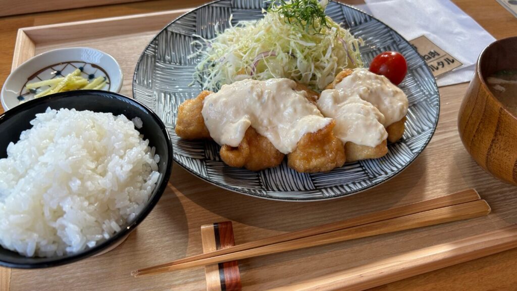 名物チキン南蛮定食 ムネ肉、ふつうタルタル、汁物はミニうどん